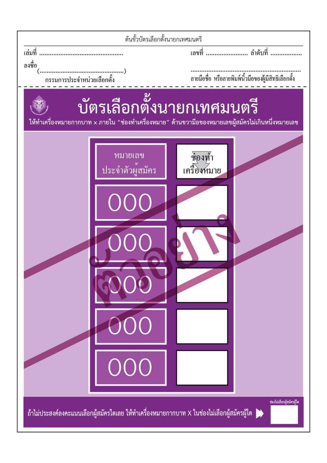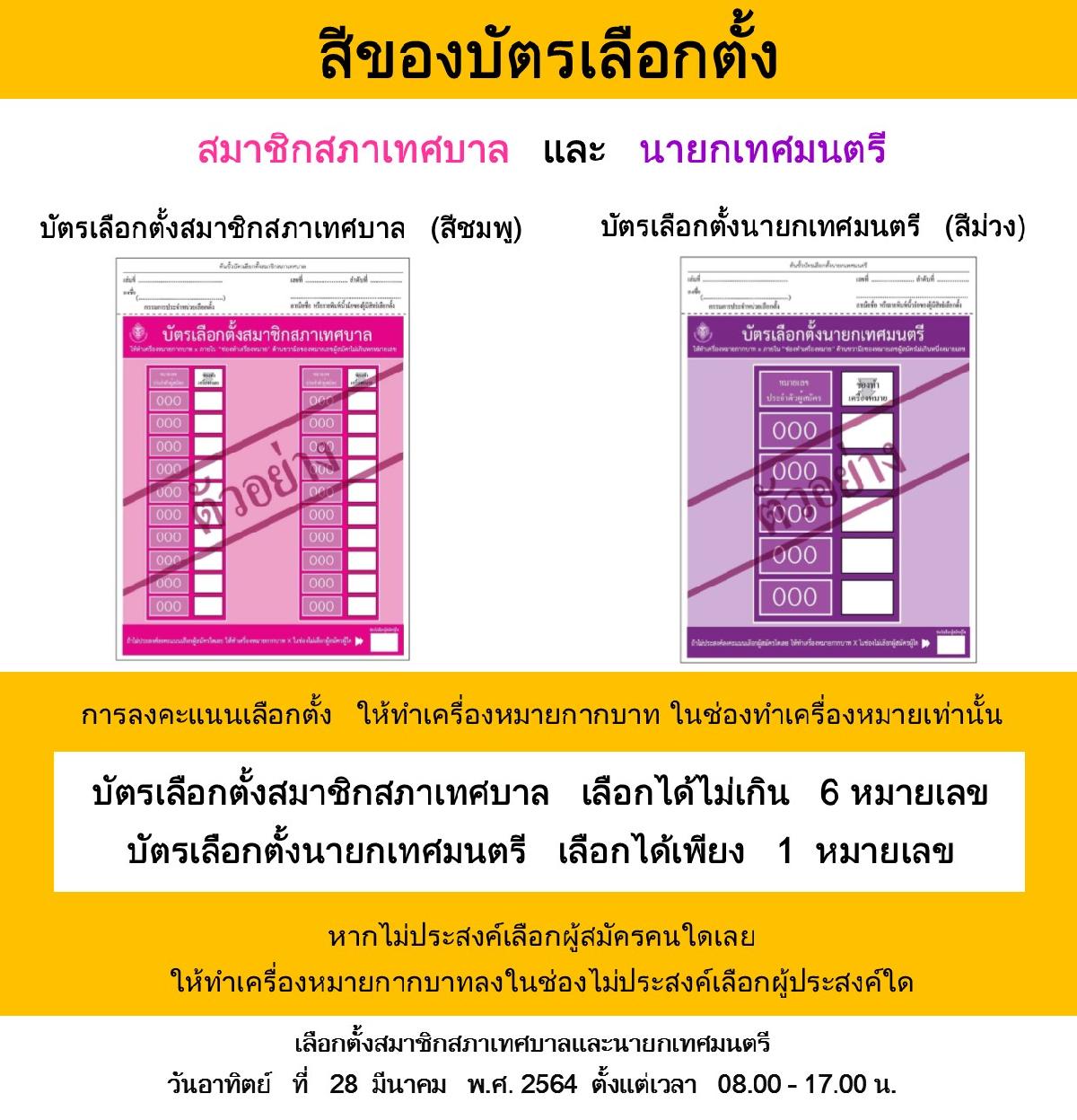 ตัวอย่างบัตรเลือกตั้งที่ใช้ในการลงคะแนนเลือกตั้งสมาชิกสภาเทศบาลและนายกเทศมนตรี ในวันอาทิตย์ที่ 28 มีนาคม 2564