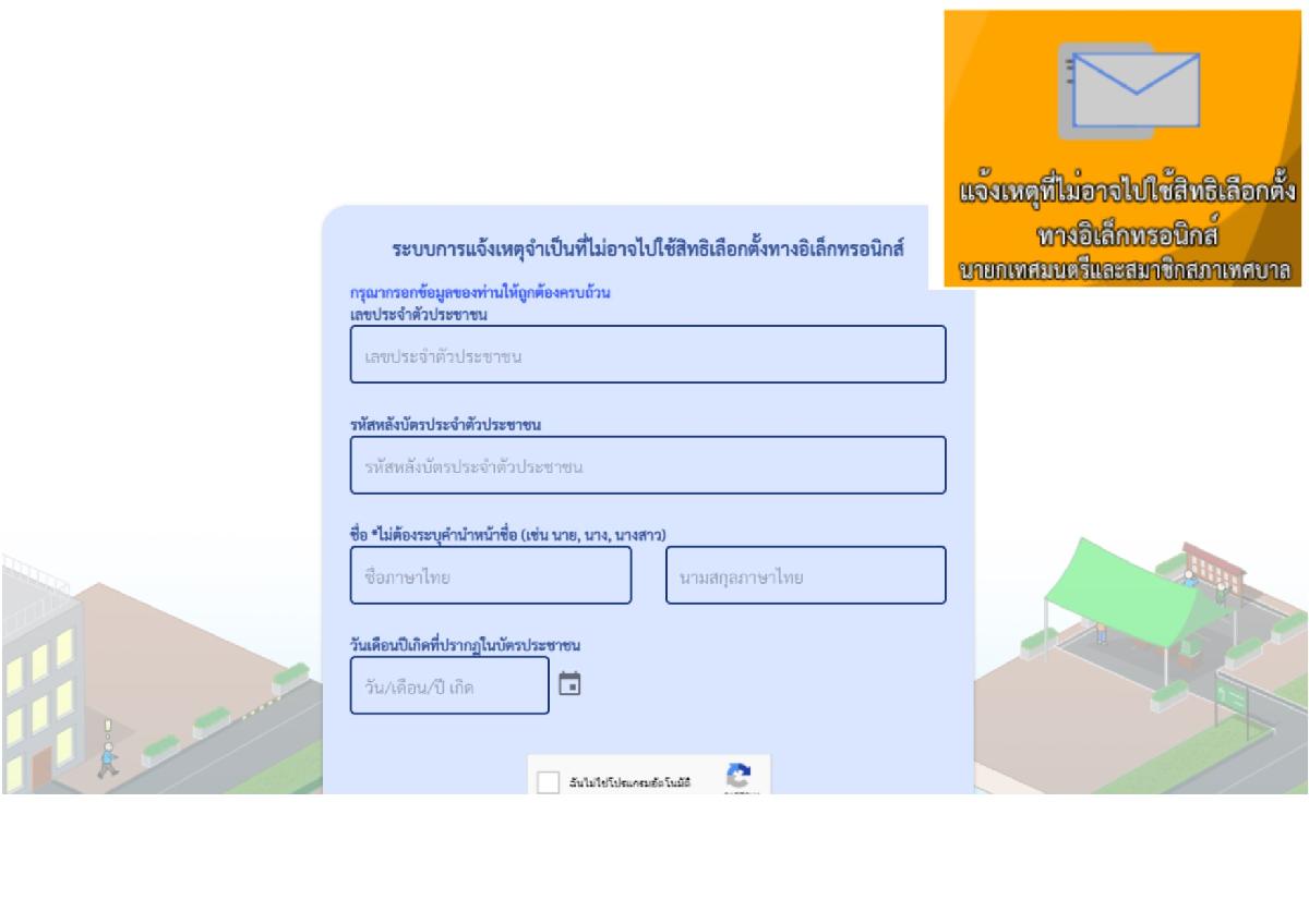สามารถแจ้งเหตุจำเป็นที่ไม่อาจไปใช้สิทธิเลือกตั้งสมาชิกสภาท้องถิ่นหรือผู้บริหารท้องถิ่น ทางอิเล็กทรอนิกส์ เพิ่มอีกช่องทางหนึ่ง ทางลิ้งค์ด้านล่างนี้