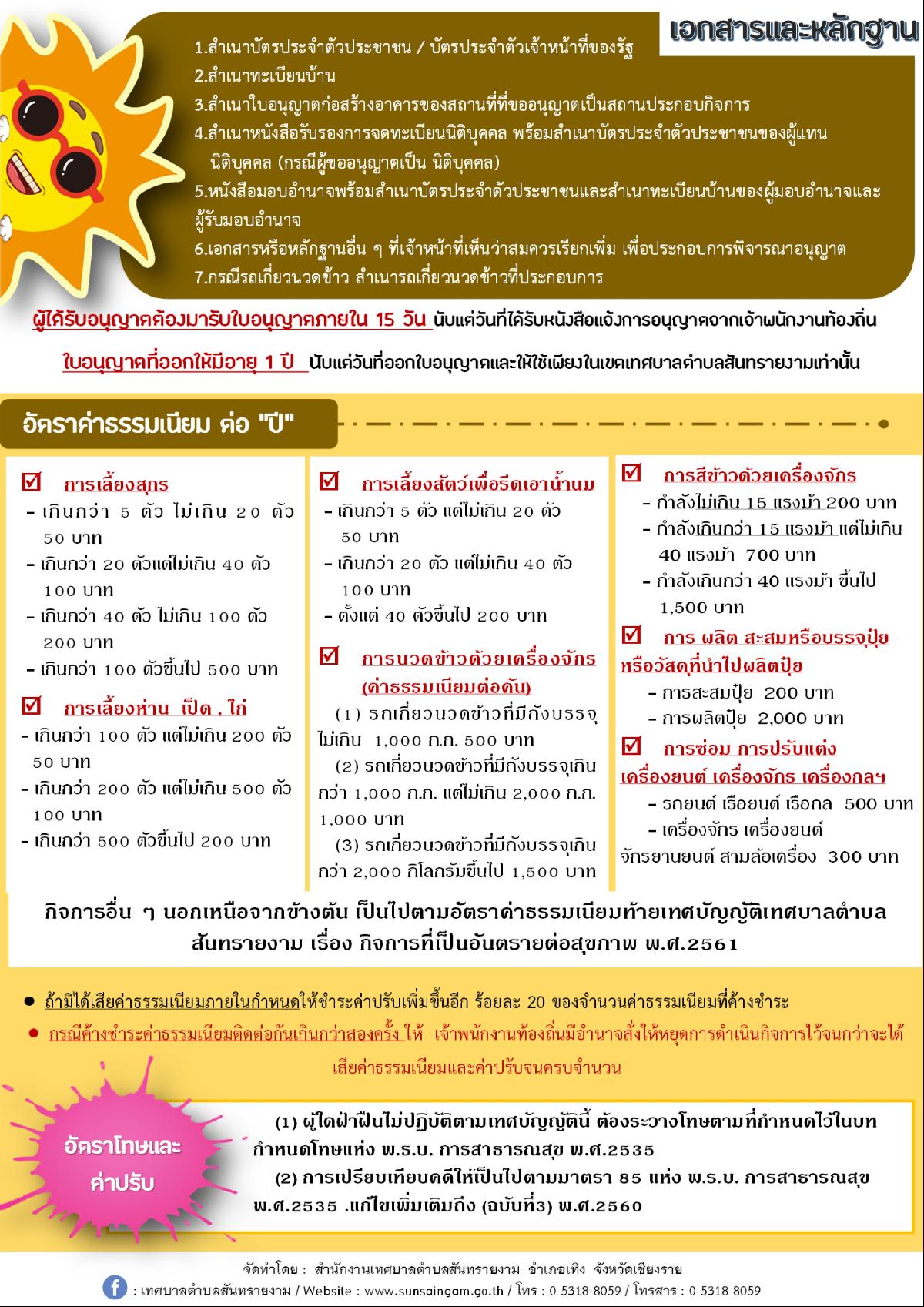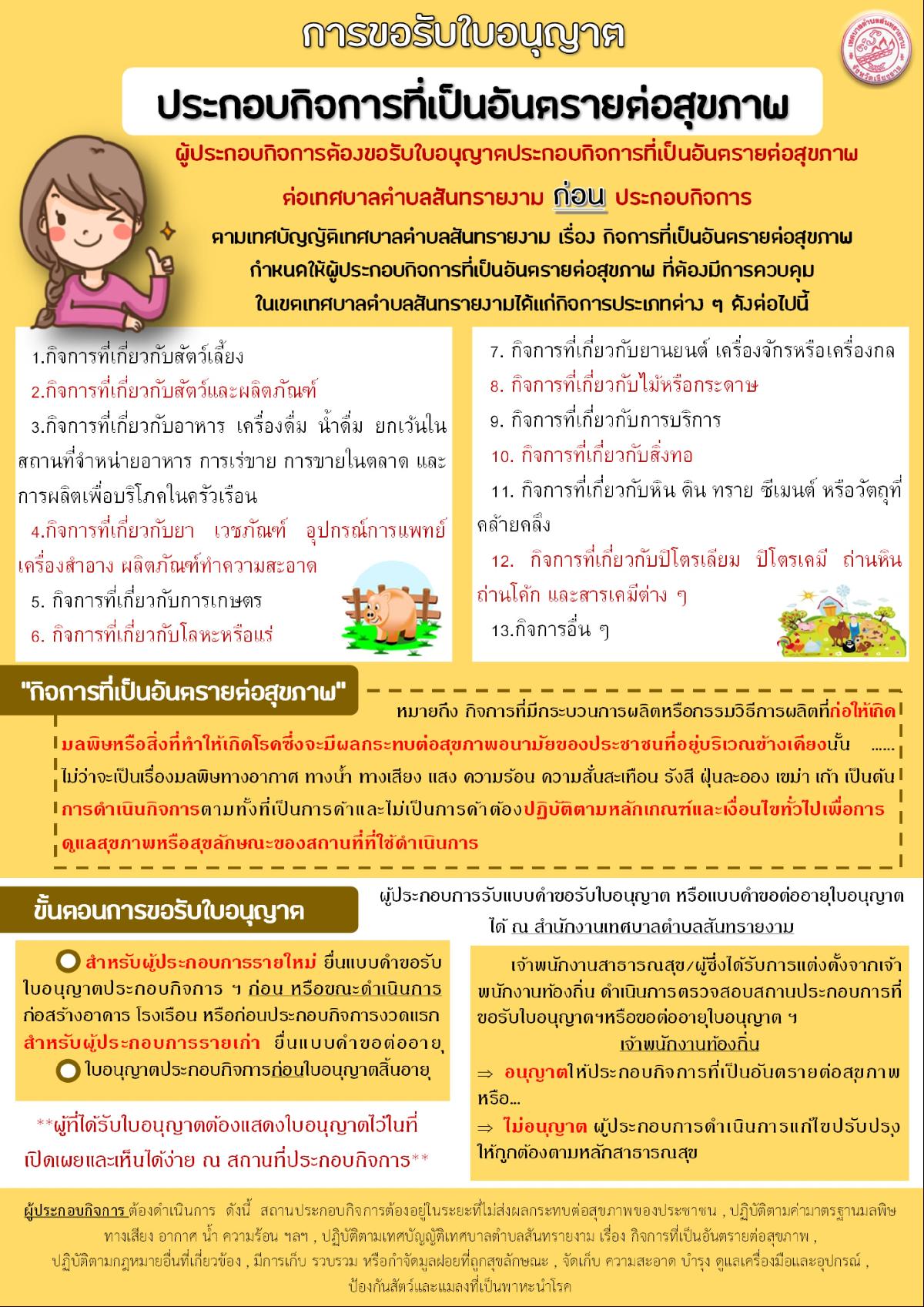 ประชาสัมพันธ์..การขอรับใบอนุญาตก่อนประกอบกิจการที่เป็นอันตรายต่อสุขภาพ หรือ ขอต่ออายุใบอนุญาตประกอบกิจการที่เป็นอันตรายต่อสุขภาพ..ในพื้นที่ตำบลสันทรายงาม