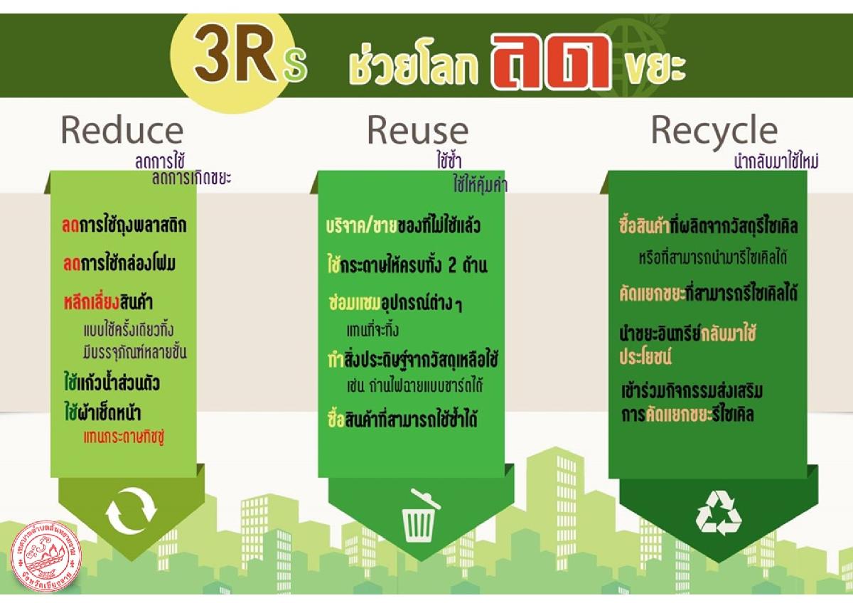 3.รีไซเคิล (Recycle) รีไซเคิล เป็นการนำวัสดุต่างๆ อย่างเช่น กระดาษ แก้ว พลาสติก เหล็ก อะลูมิเนียม ฯลฯ มาแปรรูปโดยกรรมวิธีต่างๆ เพื่อนำกลับมาใช้ใหม่ ซึ่งนอกจากจะเป็นการลดปริมาณขยะมูลฝอยแล้ว ยังเป็นการลดการใช้พลังงานและลดมลพิษที่เกิดกับสิ่งแวดล้อม