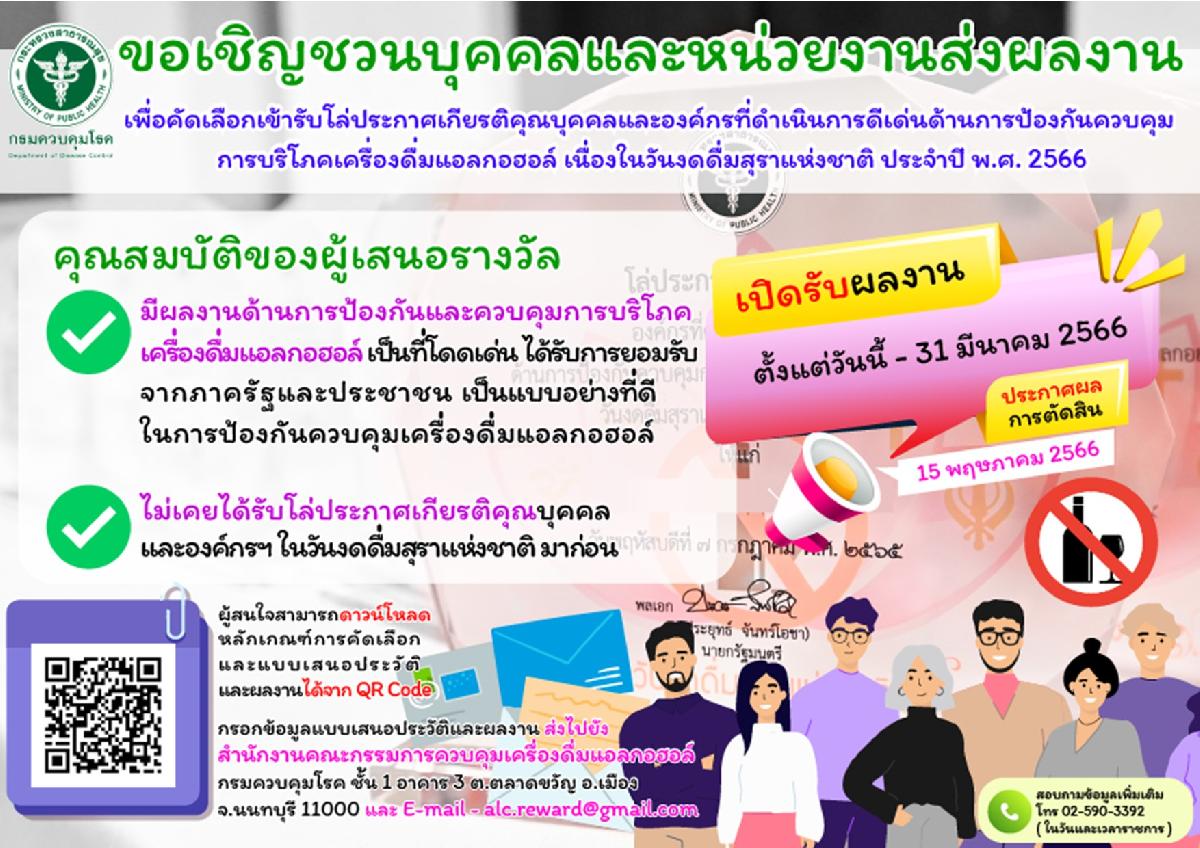 ขอเชิญชวนบุคคลและหน่วยงานส่งผลงานเพื่อคัดเลือกเข้ารับโล่ประกาศเกียรติคุณบุคคลและองค์กรที่ดำเนินการดีเด่นด้านการป้องกันควบคุมการบริโภคเครื่องดื่มแอลกอฮอล์เนื่องในวันงดดื่มสุราแห่งชาติ ประจำปี พ.ศ. 2566
