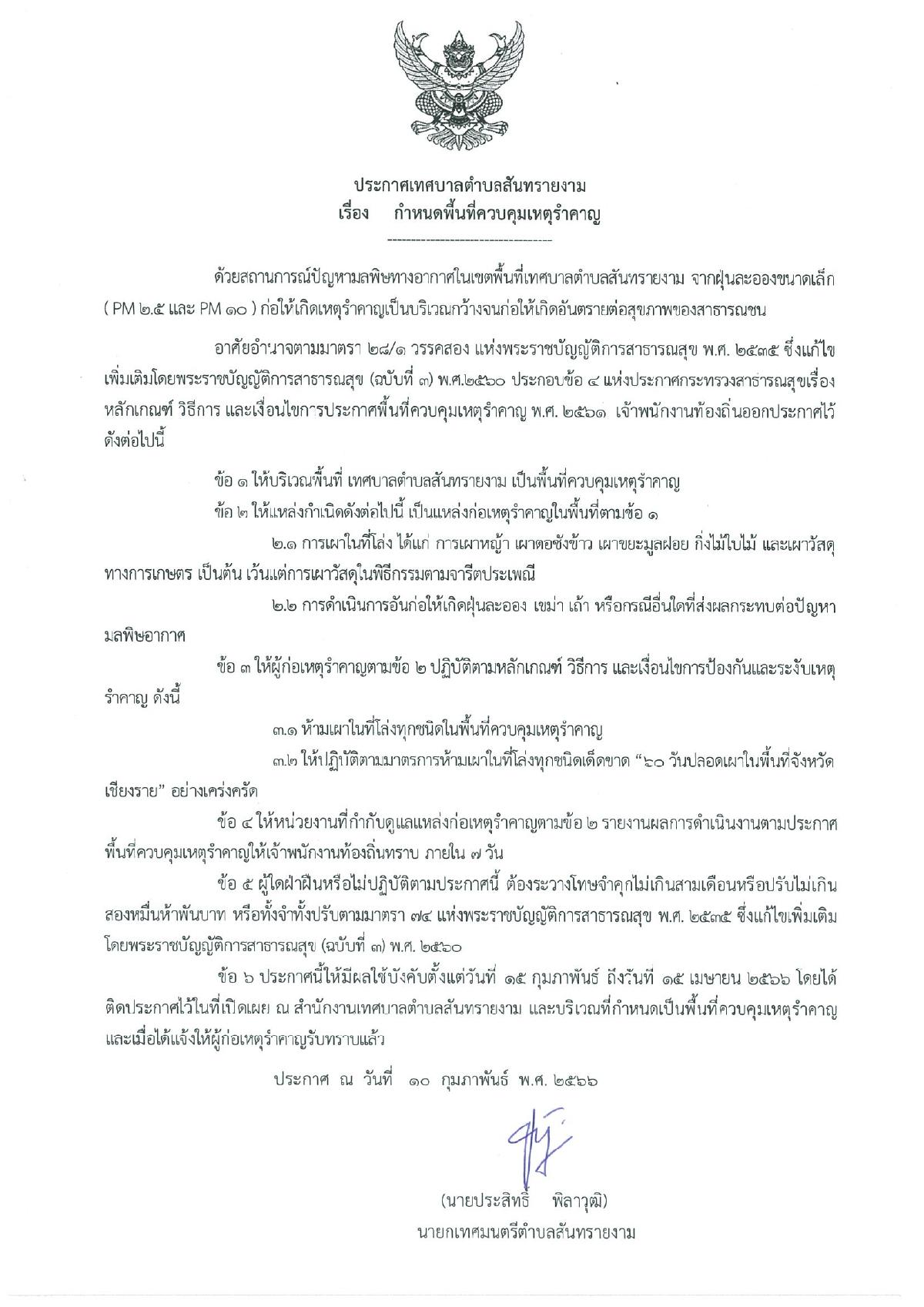 ประกาศเทศบาลตำบลสันทรายงาม เรื่อง กำหนดพื้นที่ควบคุมเหตุรำคาญ ประจำปี 2566