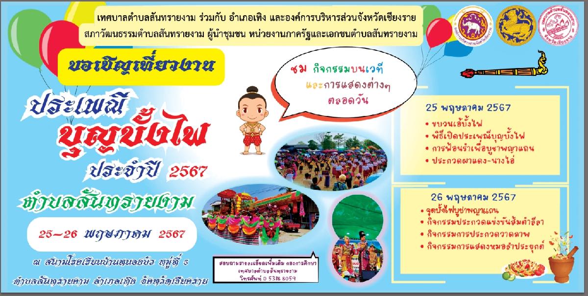 ขอเชิญชวนเที่ยวงาน "ประเพณีบุญบั้งไฟ ประจำปี 2567" ในวันที่ 25 - 26 พฤษภาคม 2567 ณ บ้านหนองบัว หมู่ที่ 5 ตำบลสันทรายงาม อำเภอเทิง จังหวัดเชียงราย