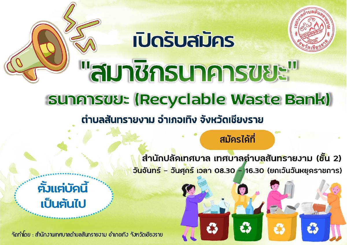 เทศบาลตำบลสันทรายงาม ได้จัดตั้งธนาคารขยะขึ้นเพื่อขับเคลื่อนนโยบายการจัดการขยะมูลฝอยในชุมชน โดยสนับสนุนให้ประชาชนคัดแยกขยะที่ต้นทางภายใต้หลัการ 3Rs คือ การใช้น้อยลง การใช้ซ้ำ และการนำกลับมาใช้ใหม่ จึงนำไปสู่การจัดตั้งธนาคารขยะขึ้นมา ขอเชิญชวนประชาชนตำบลวังหามแห เข้าร่วมเป็นสมาชิกธนาคารขยะ โดยรับซื้อขยะรีไซเคิล เพื่อสร้างการมีส่วนร่วมในการคัดแยกขยะในชุมชน เปลี่ยนขยะให้เป็นรายได้แก่ครัวเรือน
